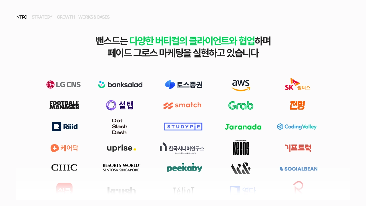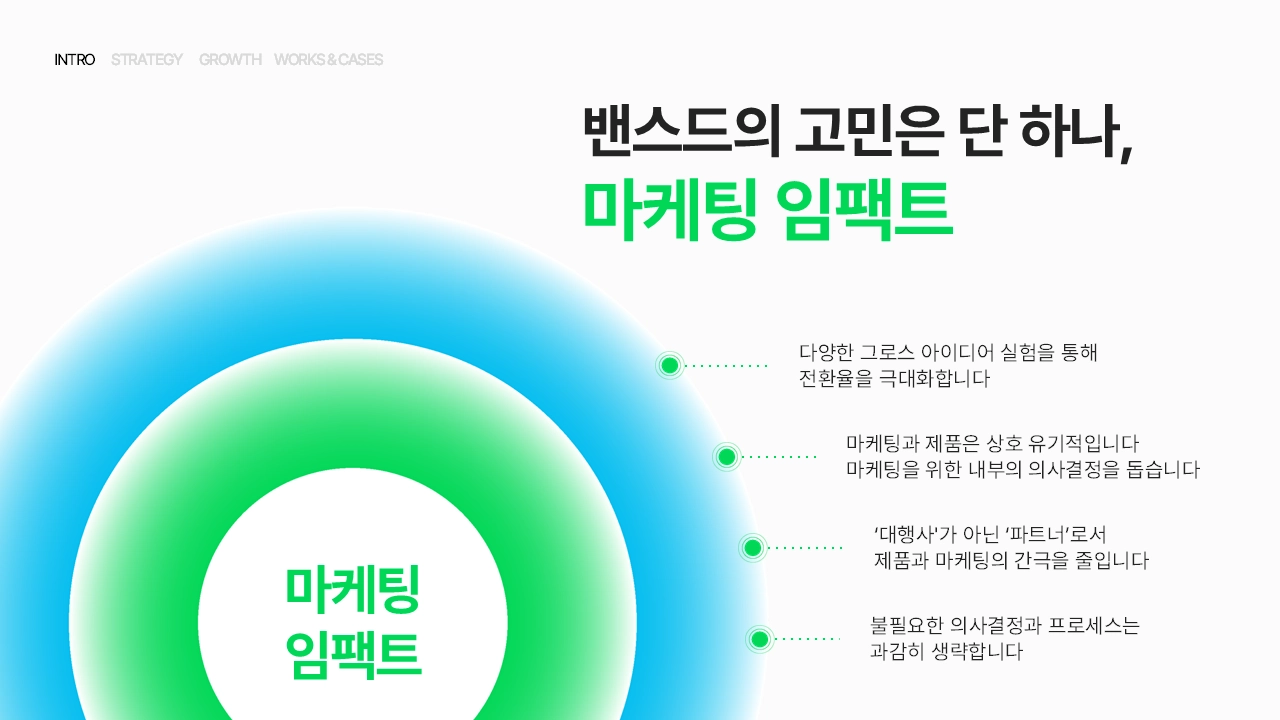 밴스드는 메타, 11번가, 에코마케팅, 매드업을 거쳐온 대표 컨설턴트 박기덕 대표가 창업한 페이드 그로스 마케팅 컴퍼니입니다. 단순 퍼포먼스 마케팅을 넘어 버티컬별 맞춤 솔루션을 통해 컨설팅하고, 마케팅을 통한 클라이언트의 궁극적 성장을 목표로 빠르게 성장하고 있습니다.